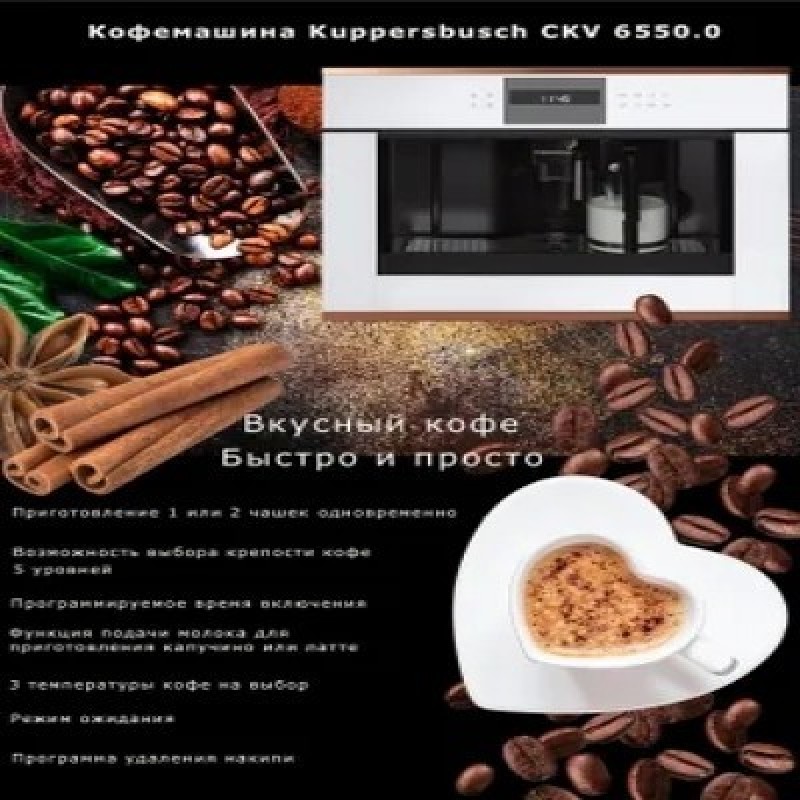 Встраиваемая кофемашина Kuppersbusch CKV 6550.0ЖК-дисплей с текстовым и графическим полями Электронная система управления с сенсорными кнопками Программируемое количество кофе для 5 размеров чашек (эспрессо, малая, средняя, большая, высокая) Приготовление 1 или 2 чашек Функция подачи молока для приготовления капучино или латте Съемный контейнер для молока с функцией очистки Возможность использования кофейных зерен или молотого кофе Регулируемый по высоте раздатчик кофе Давление при заваривании ? 15 бар 3 температуры кофе на выбор Возможность выбора крепости кофе (5 предварительно заданных уровней) Отдельные нагреватели для заваривания кофе и приготовления горячей воды Программа удаления накипи Автоматическое ополаскивание при включении и отключении Емкость для воды заполняется спереди Электронный таймер с белыми индикаторами Программируемое время включения Режим ожидания Телескопические направляющие для легкого заполнения кофемашиныПодсветка чашек:Наблюдение доставляет удовольствие - хорошо известный факт. Светодиодная подсветка преподносит только что сваренный кофе в правильном свете. И приготовление кофе становится хорошей традициейЕмкость для свежей воды:Духовые шкафы и кофемашины Kuppersbusch легко встраиваются в любую кухонную мебель, так как благодаря наличию емкости для свежей воды подсоединение к водопроводу не требуютсяХарактеристики:Потребляемая мощность: 1,35 кВт (вилка Schuko)Размеры прибора (Ш x В x Г): 595 x 455 x 475 мм (вкл. фасад 20 мм и телескопические направляющие) Размеры ниши (Ш x В x Г): 560 x 450 x 550 мм"